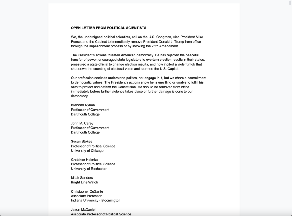 Hanover, NH — In the wake of the insurrection at the Capitol on Jan. 6, Dartmouth Government Professors Brendan Nyhan and John Carey circulated a petition among academics to call for President Trump’s removal from office. WDCR News' Lexie Farnell '24 speaks with Prof. Nyhan about what motivated him to draw up this petition and what impact he hopes it will have.